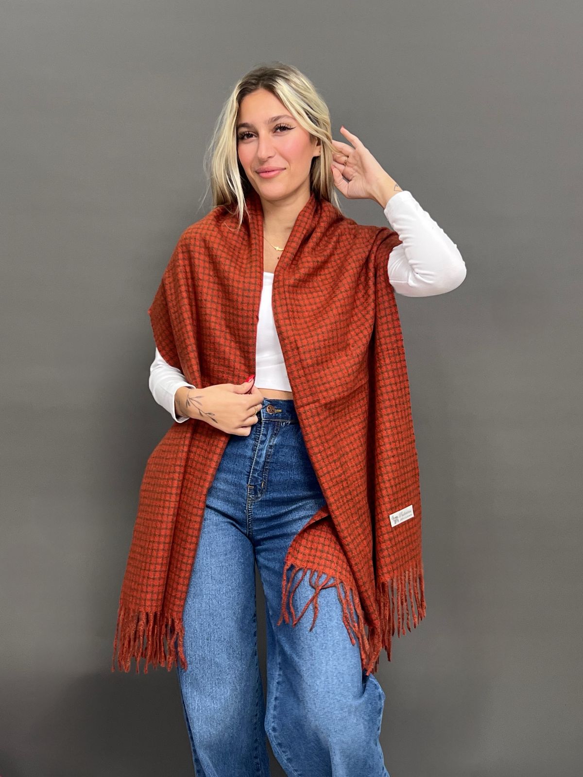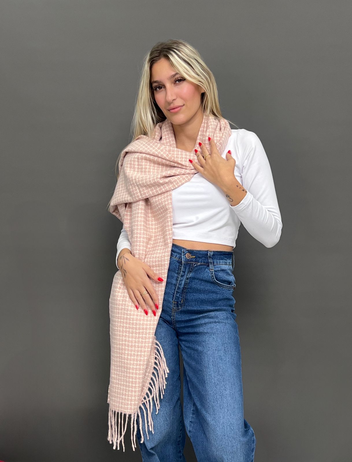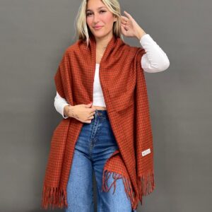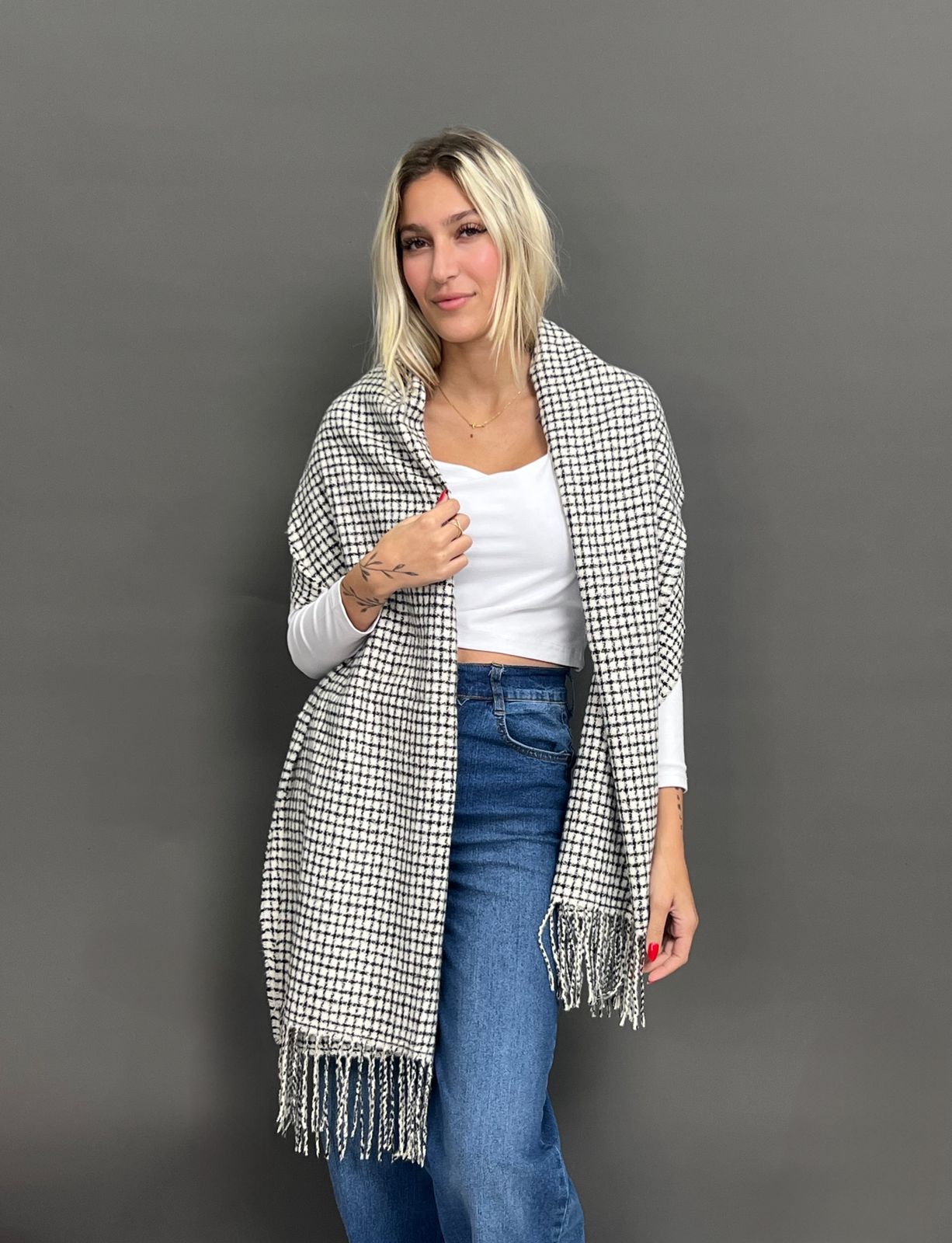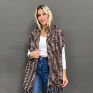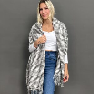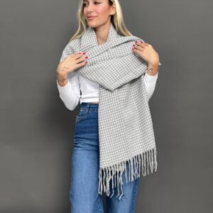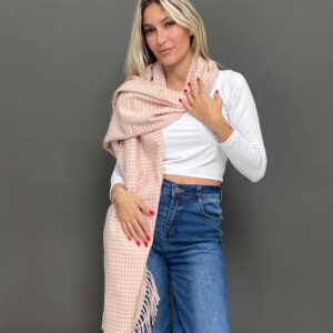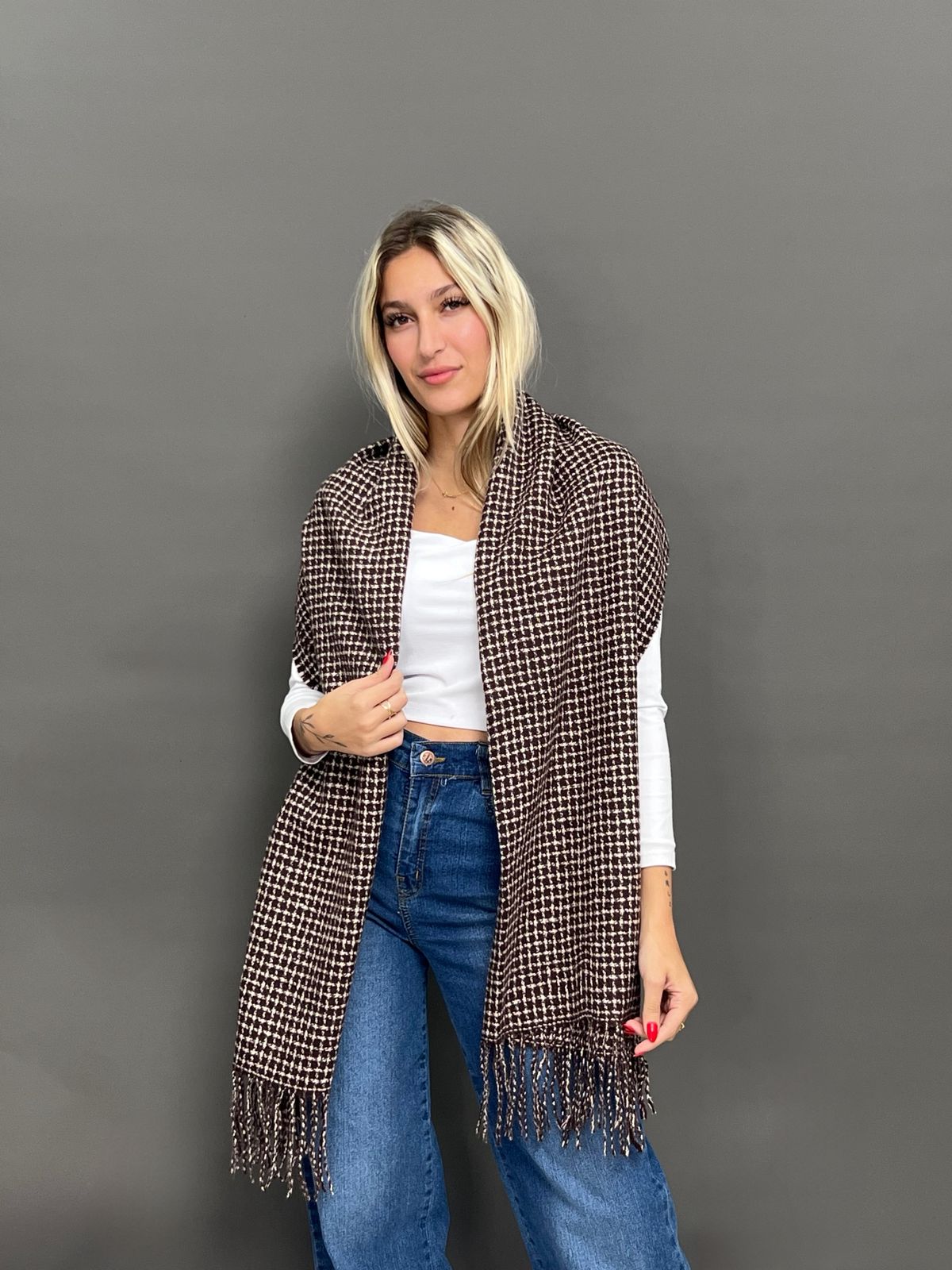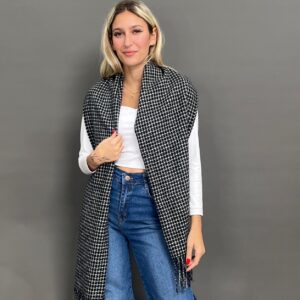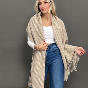 This oversized, heavy-knit scarf is a versatile accessory designed for warmth and style. It features a distinctive geometric or woven texture throughout and is finished with traditional fringe detailing at the ends. Its generous length and width make it perfect for wrapping, draping, or knotting, adding a cozy, sophisticated layer to any outfit.