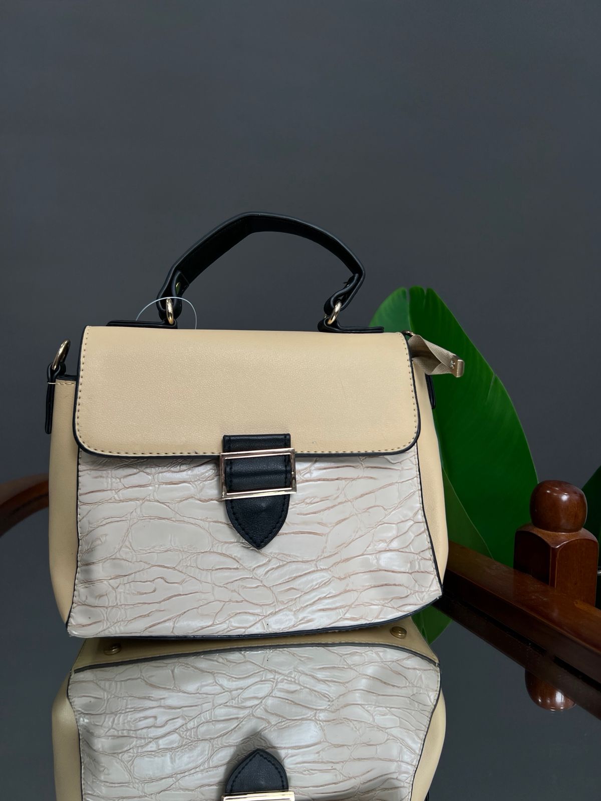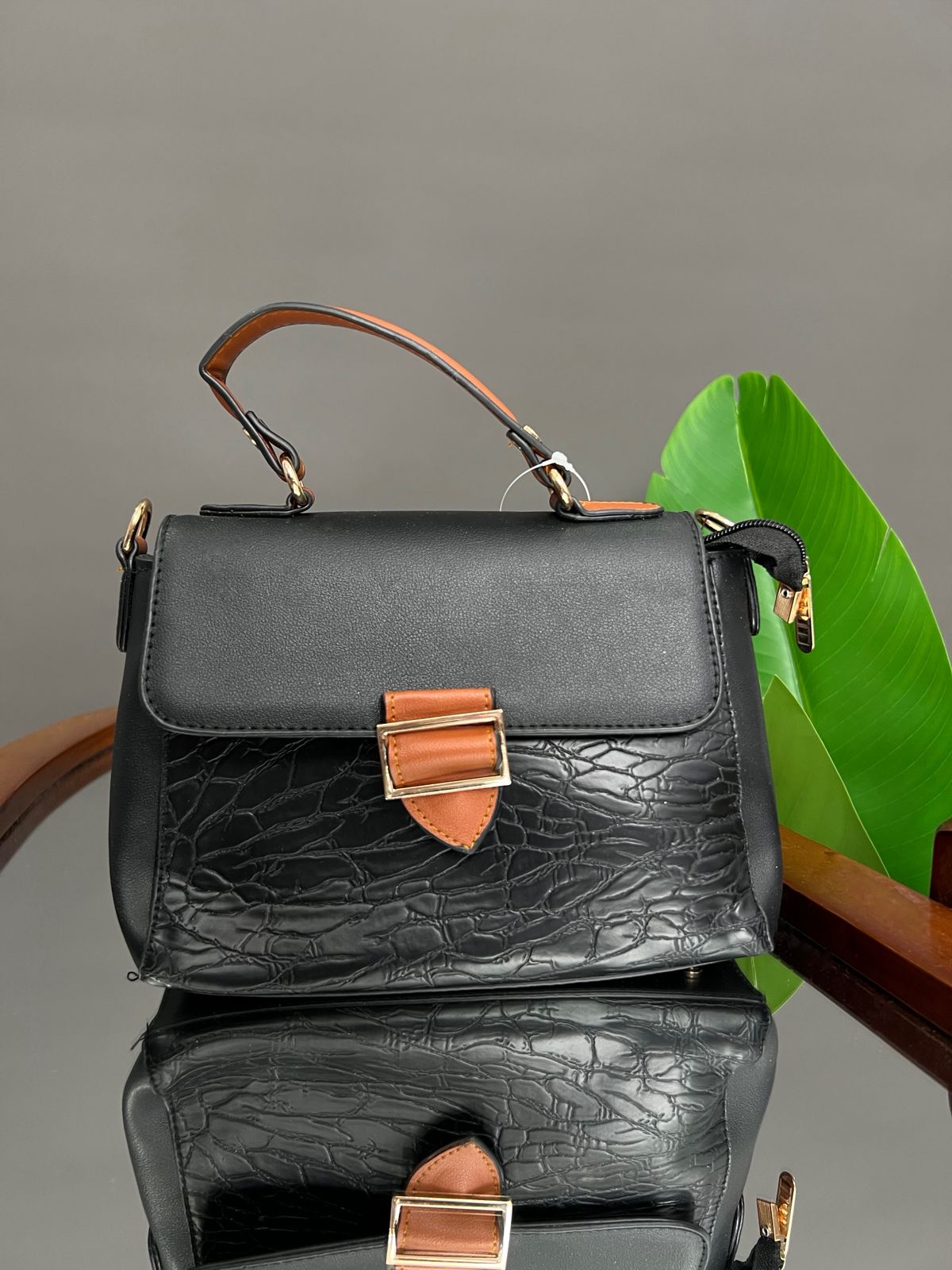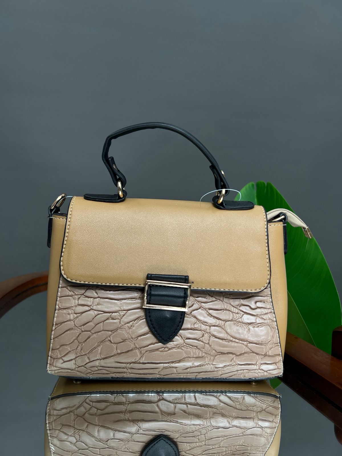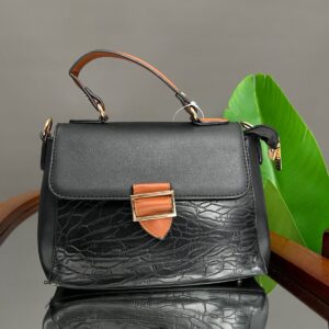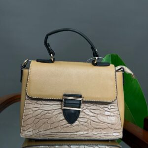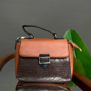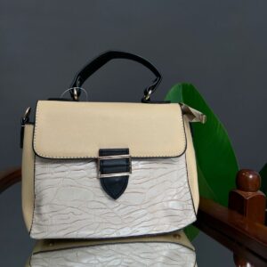 A compact, stylish satchel-style handbag featuring a flapped closure with a contrasting tab and buckle hardware detail. The lower body of the bag has a distinctive, crackle-effect texture, contrasting with the smooth material on the flap and curved top handle.