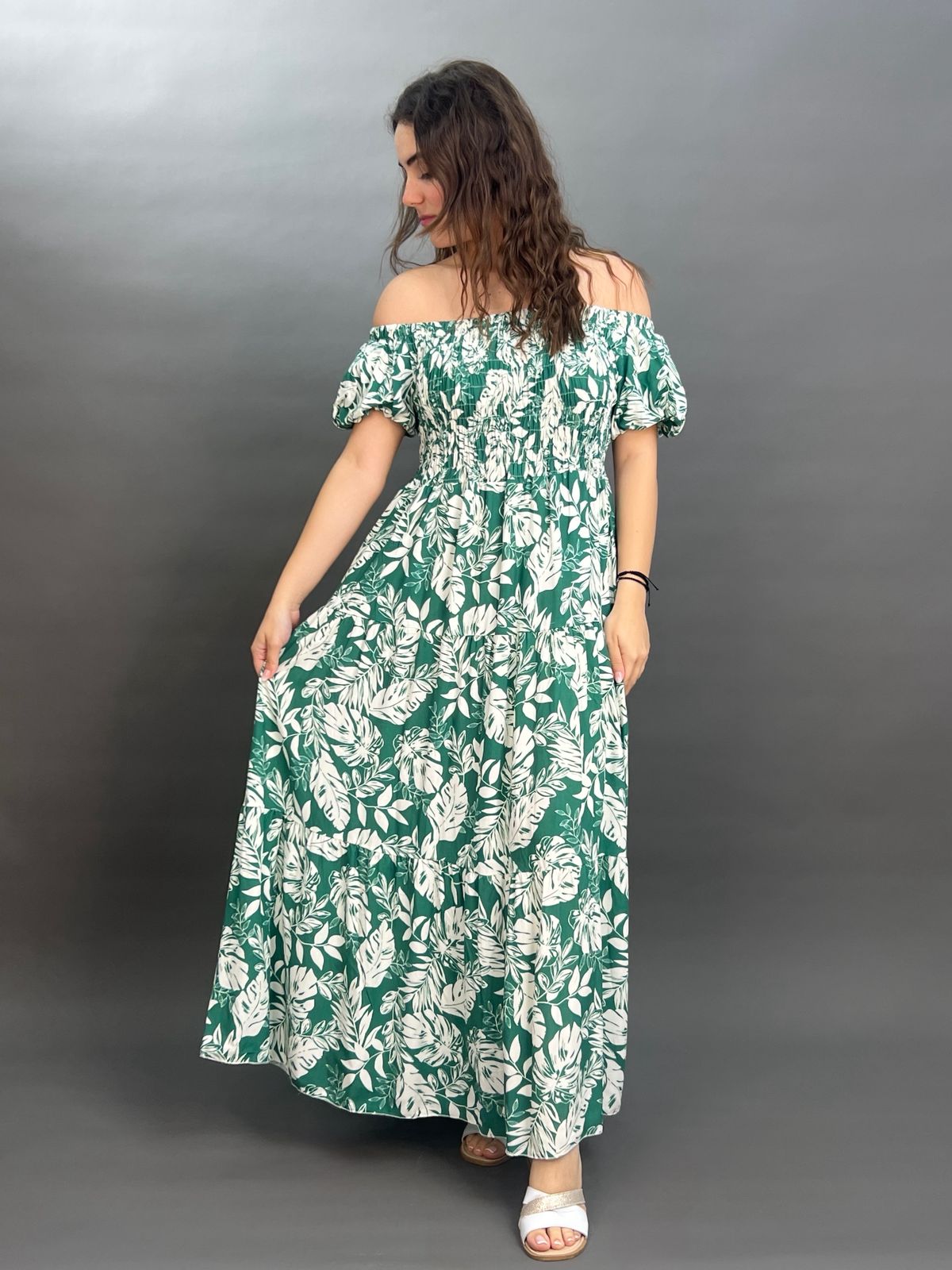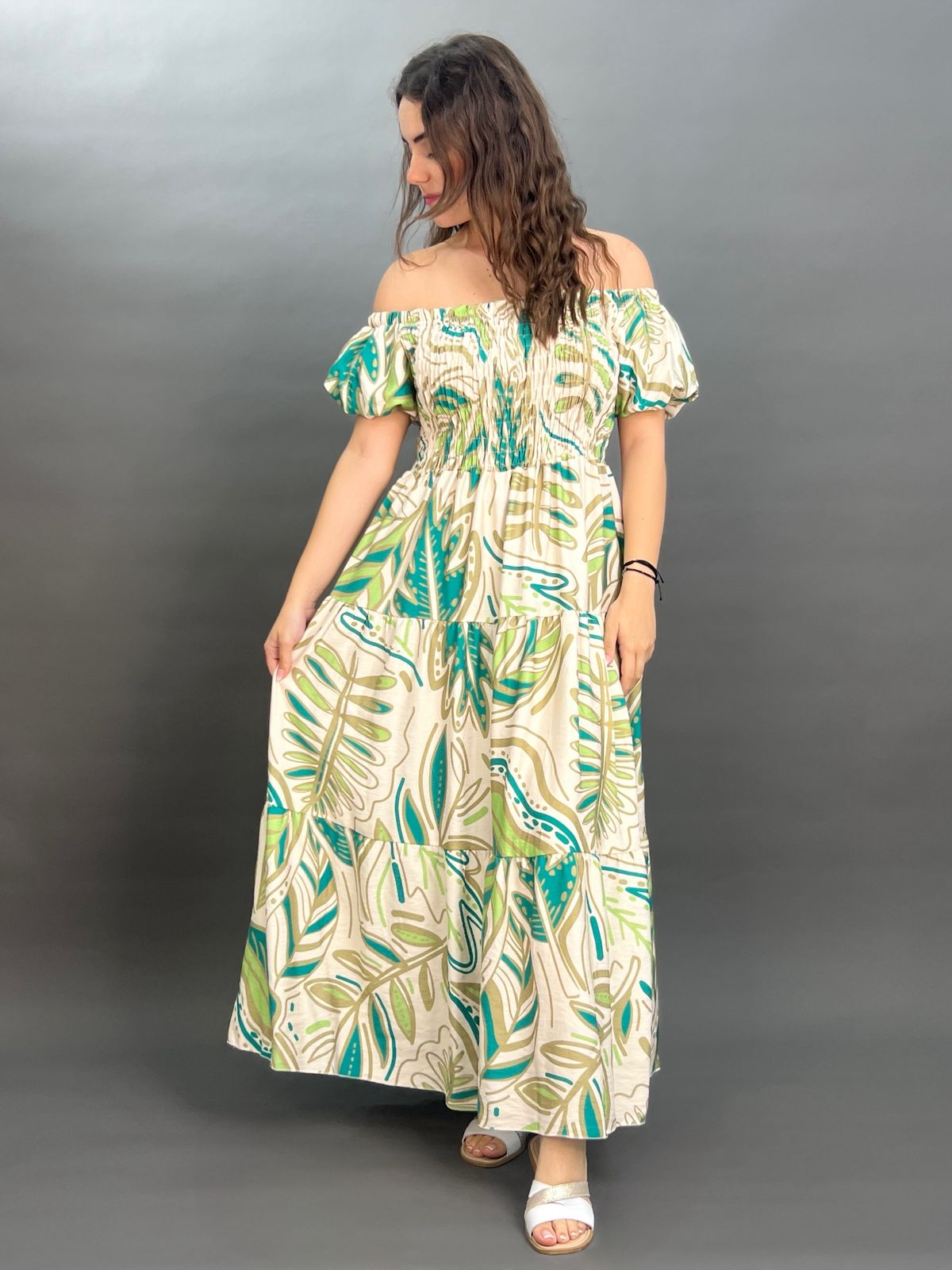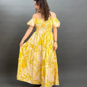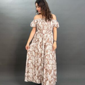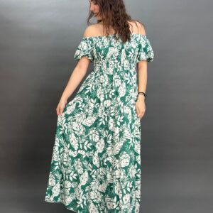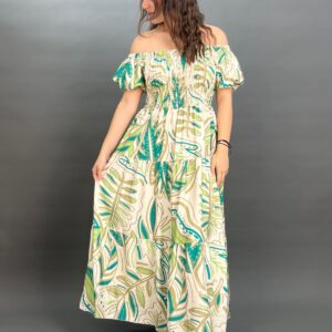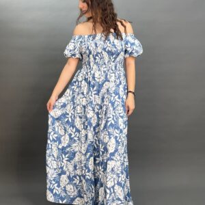 This charming maxi dress boasts an off-the-shoulder neckline with a comfortable elasticated design and puff sleeves. Its shirred bodice cinches the waist, flowing into a graceful skirt adorned with a vibrant botanical print, perfect for a breezy, resort-ready look.