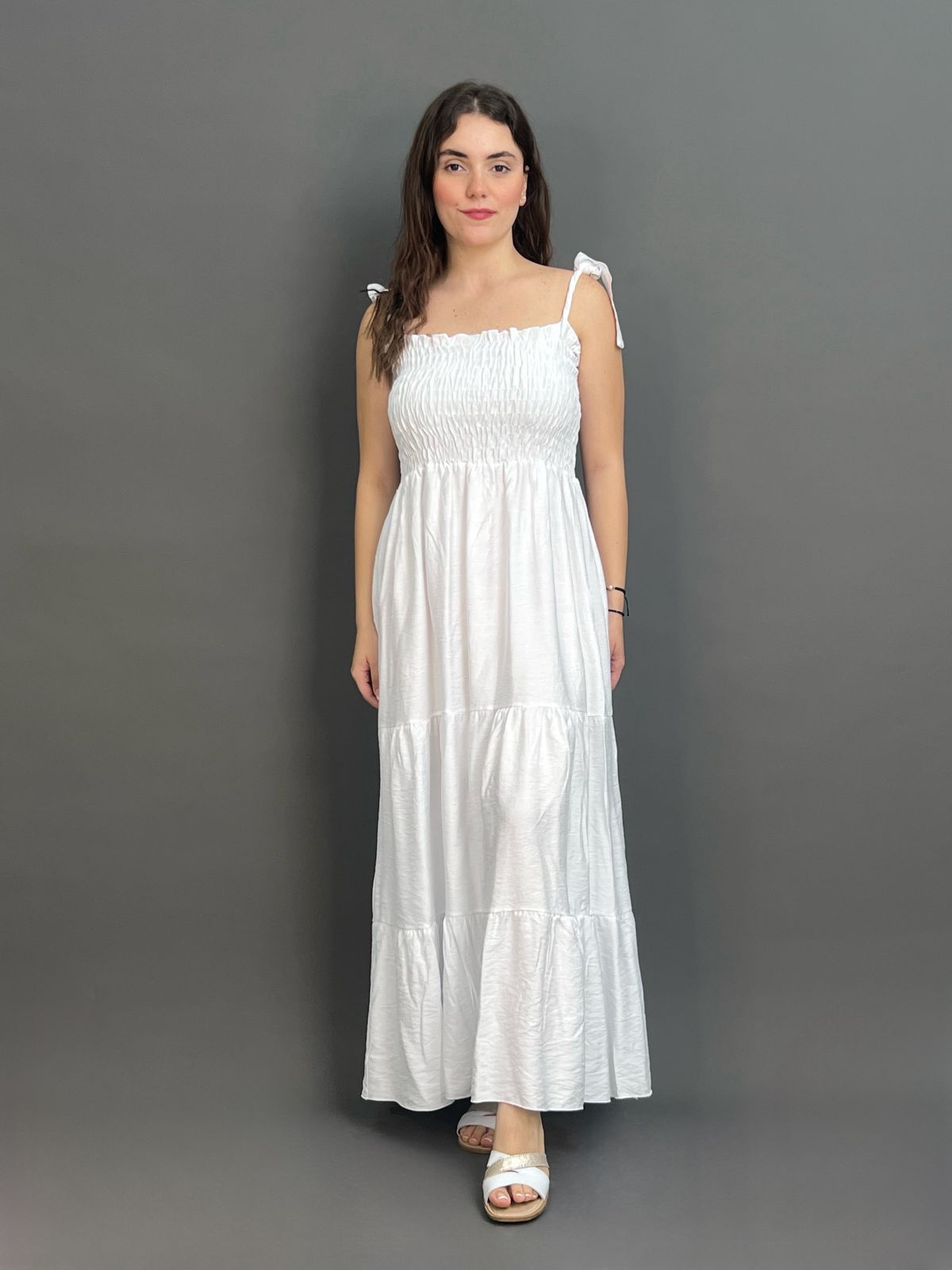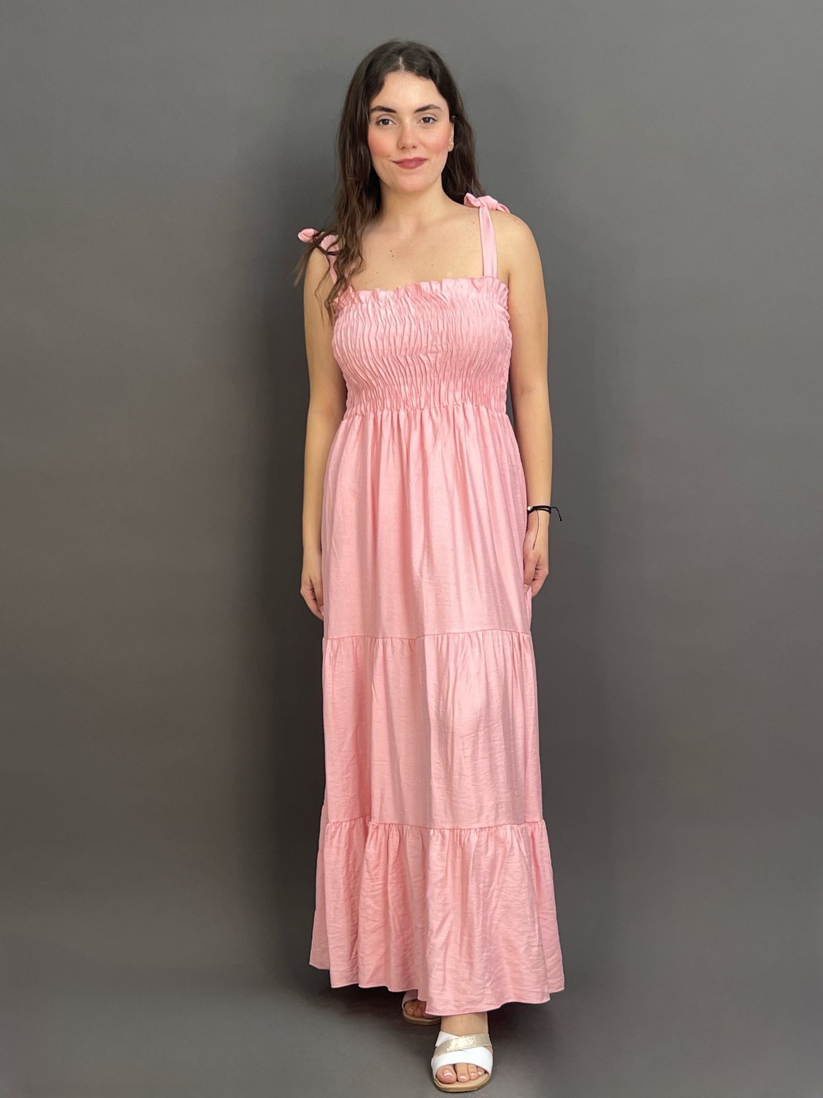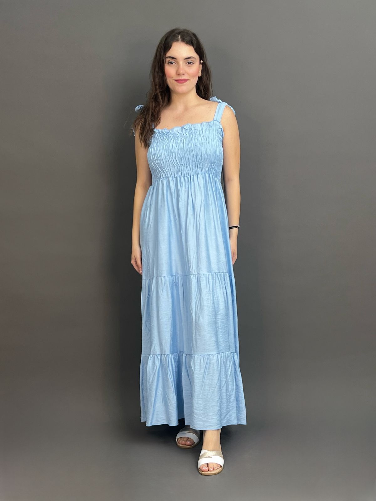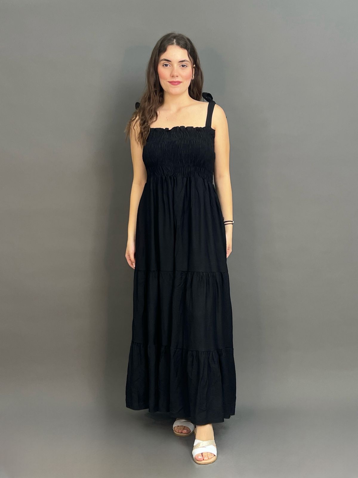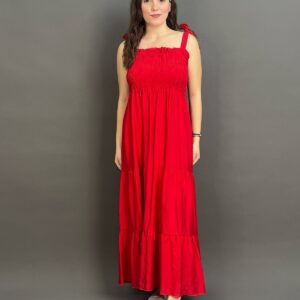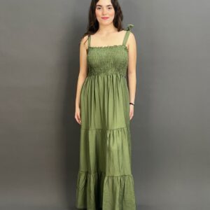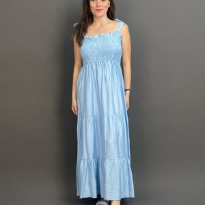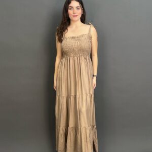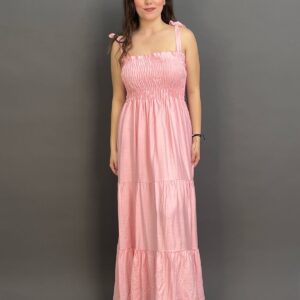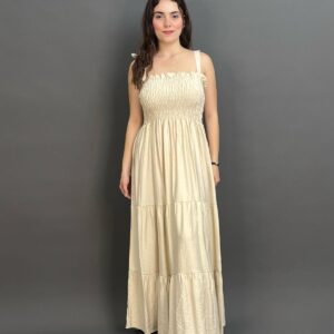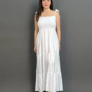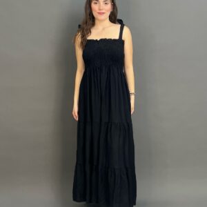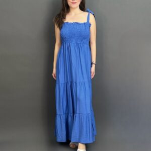This charming maxi dress features delicate tie-shoulder straps and a beautifully shirred bodice, creating a comfortable yet flattering fit. Its long, flowing skirt offers an effortlessly chic silhouette, ideal for relaxed days and evening strolls.