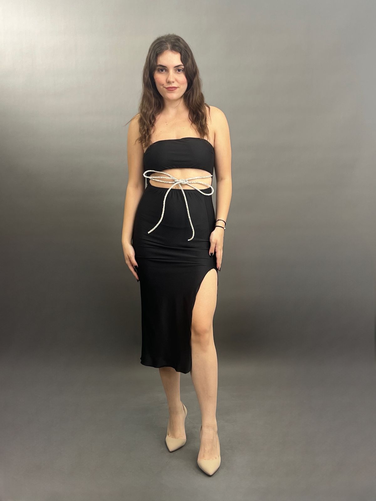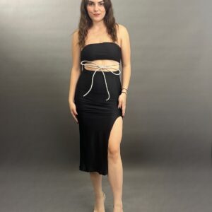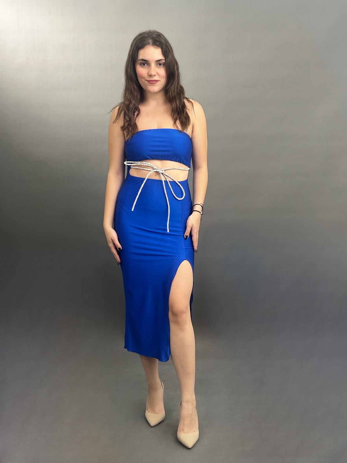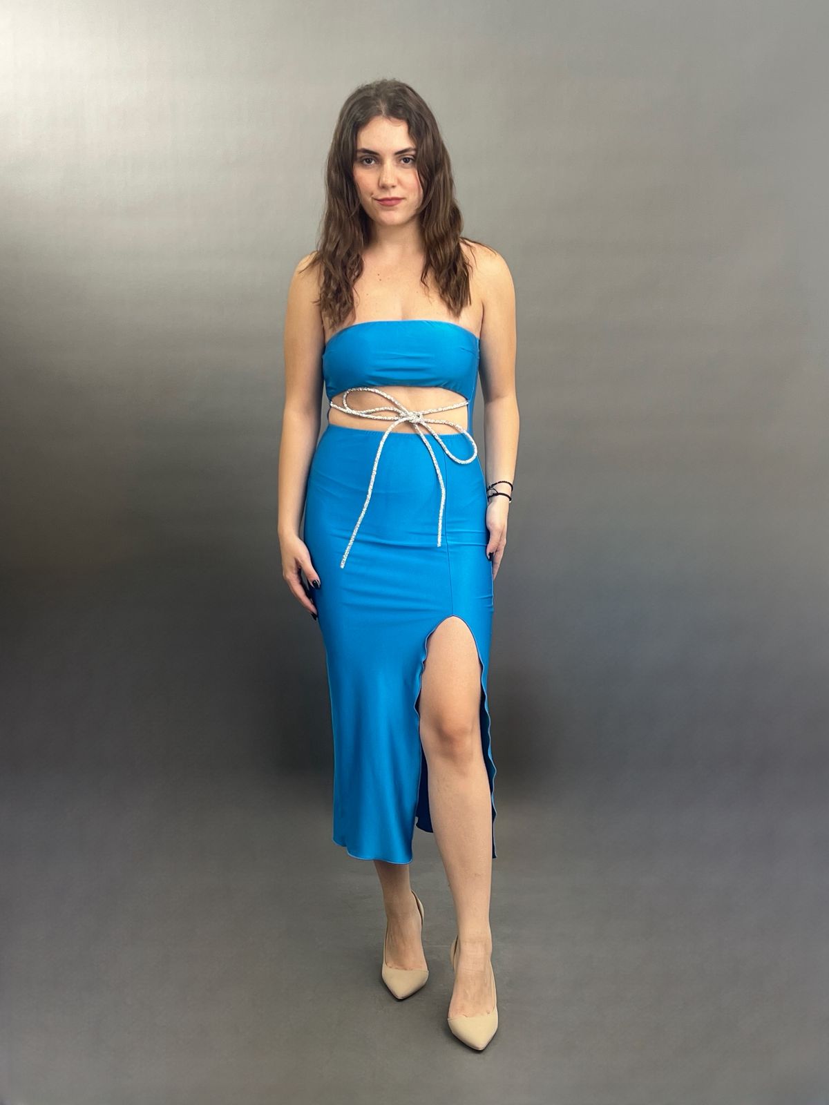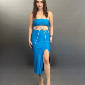This chic two-piece ensemble features a flattering strapless bandeau top and a coordinating midi skirt with a stylish side slit. A versatile waist tie detail adds a touch of bohemian flair, allowing for adjustable styling.
