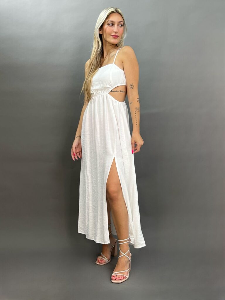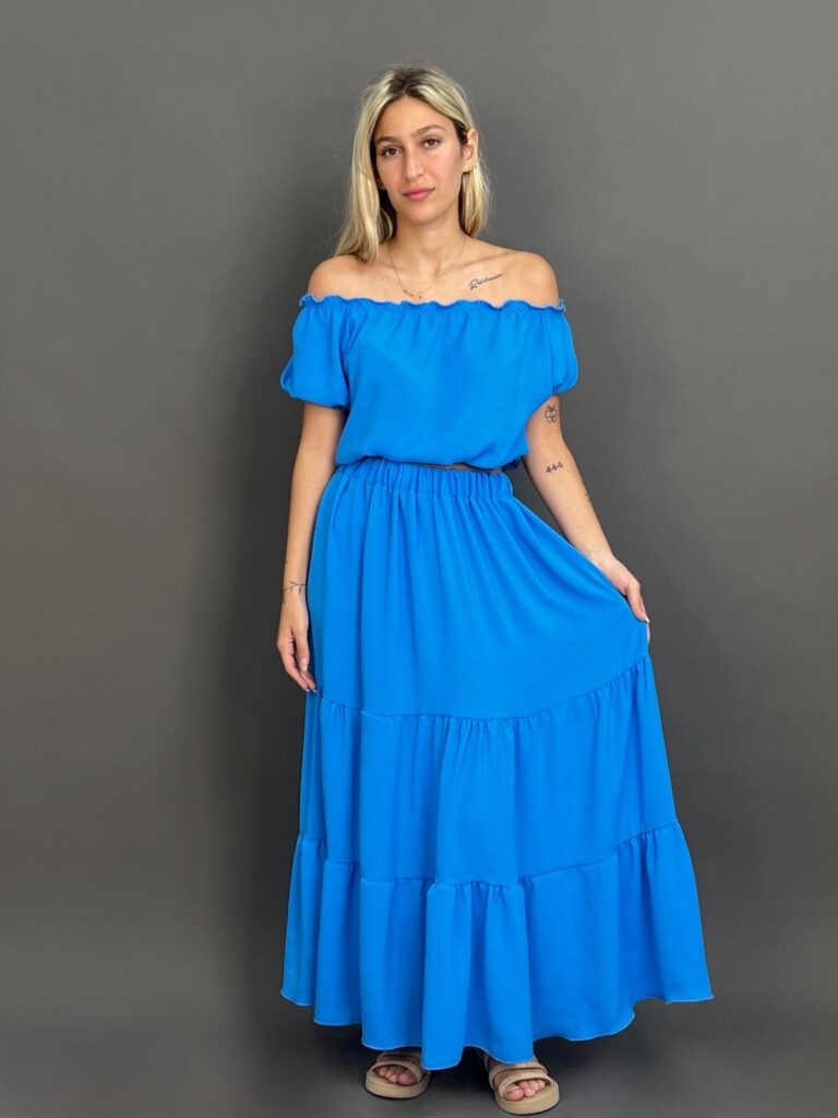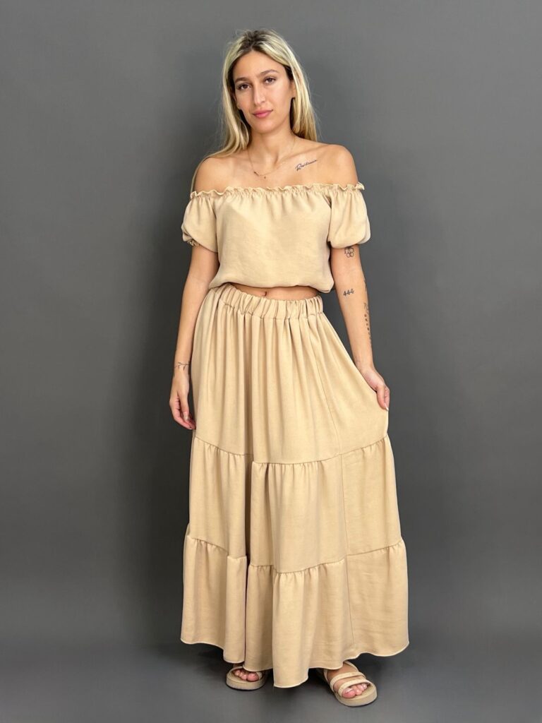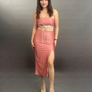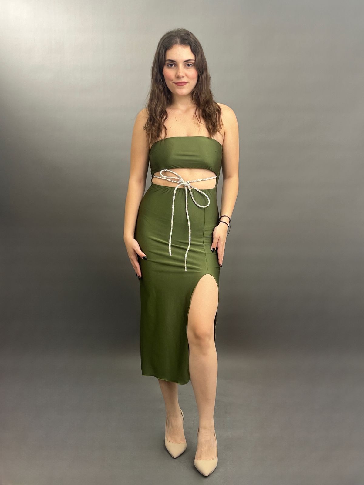 This chic two-piece ensemble features a flattering strapless bandeau top and a coordinating midi skirt with a stylish side slit. A versatile waist tie detail adds a touch of bohemian flair, allowing for adjustable styling.