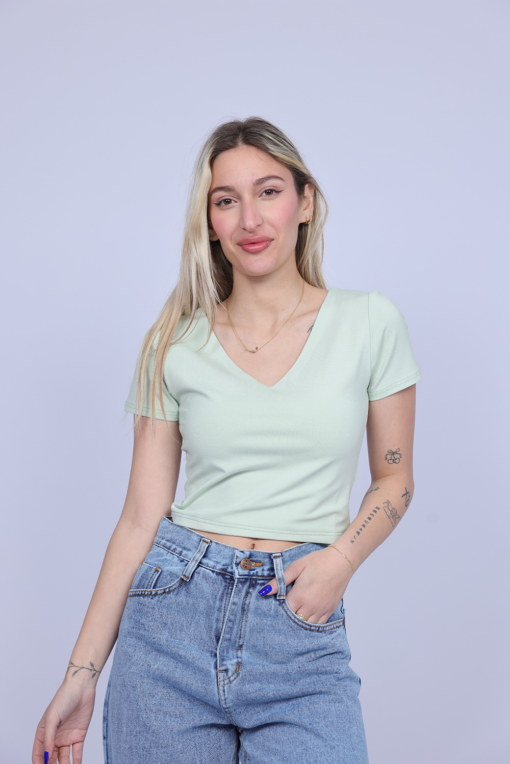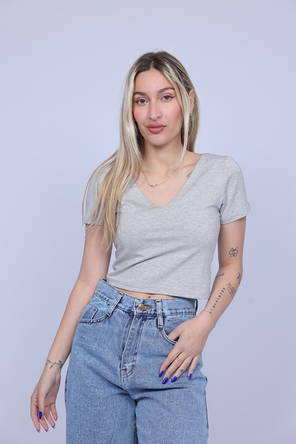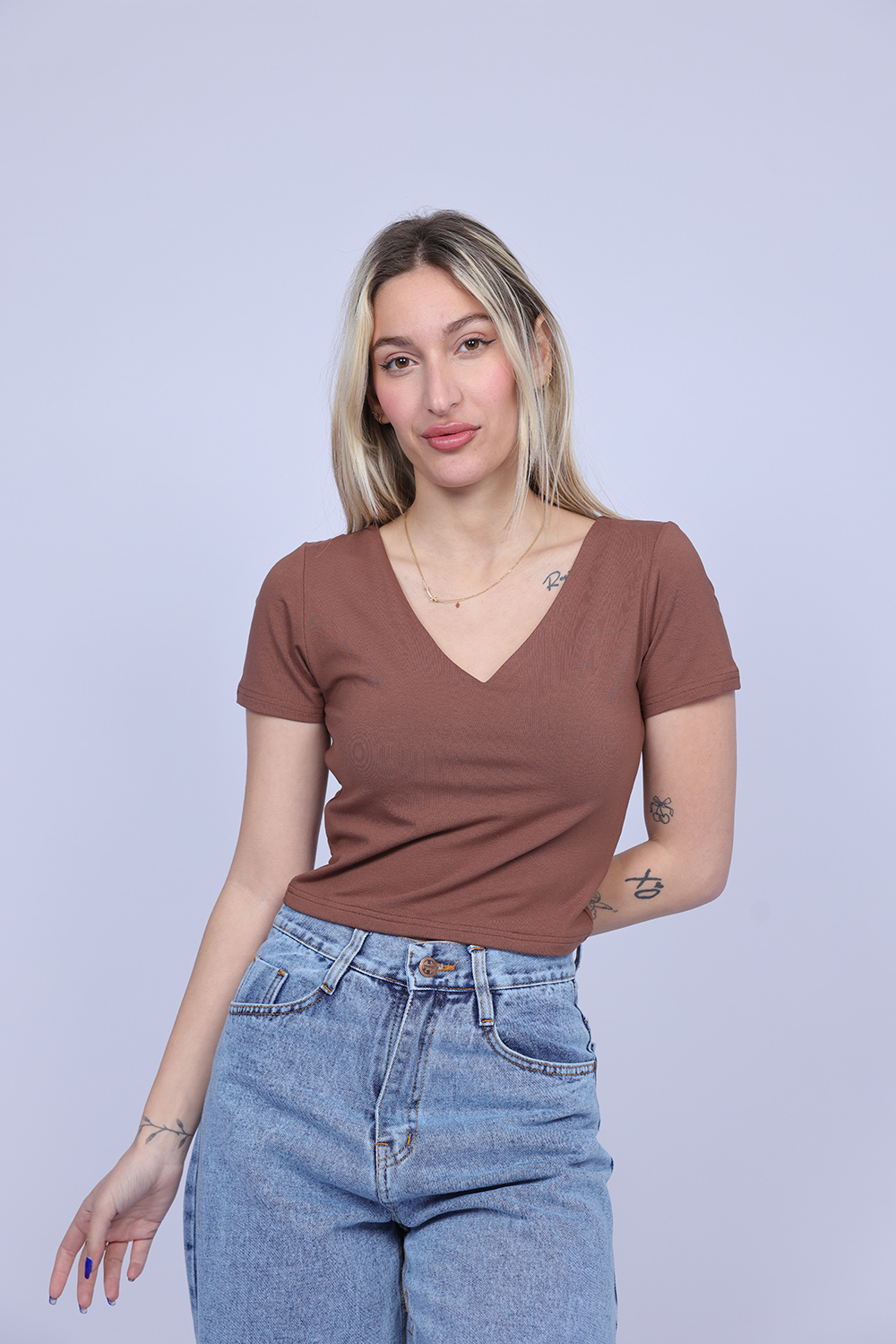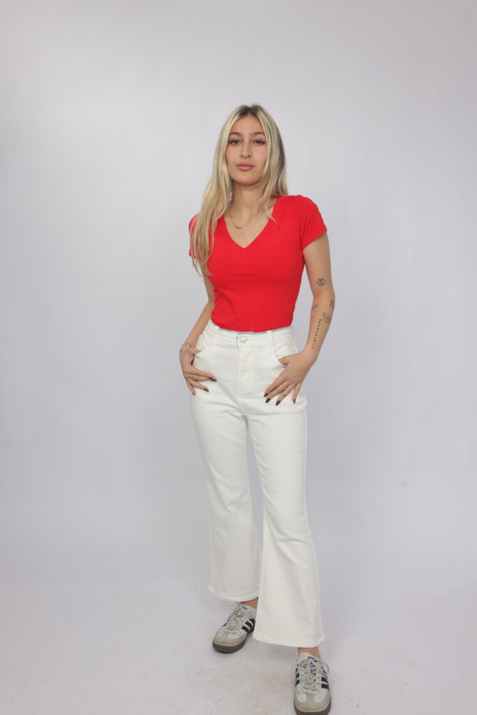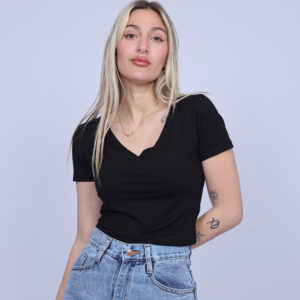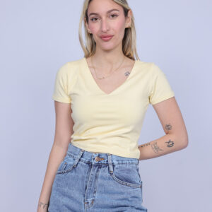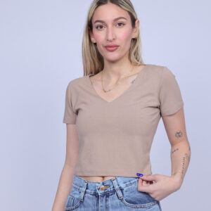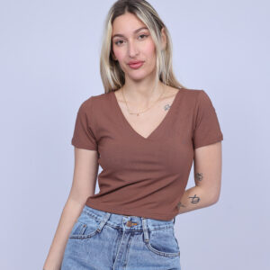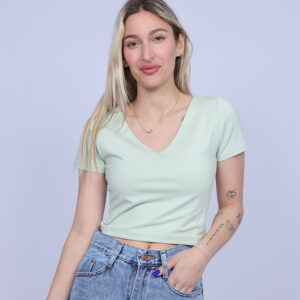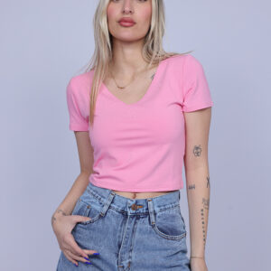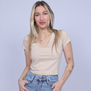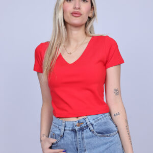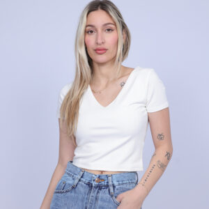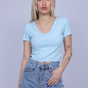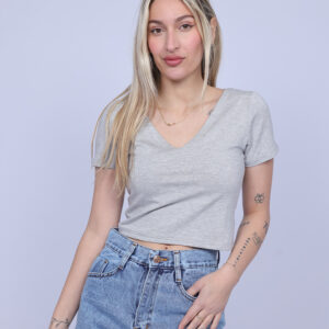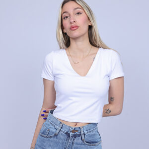 A simple and stylish cropped T-shirt designed with a flattering V-neckline that adds a feminine and modern touch. The fitted silhouette highlights the shape while keeping the look comfortable and easy to wear. Perfect for casual everyday outfits, this versatile piece pairs effortlessly with high-waisted jeans, skirts, or shorts.