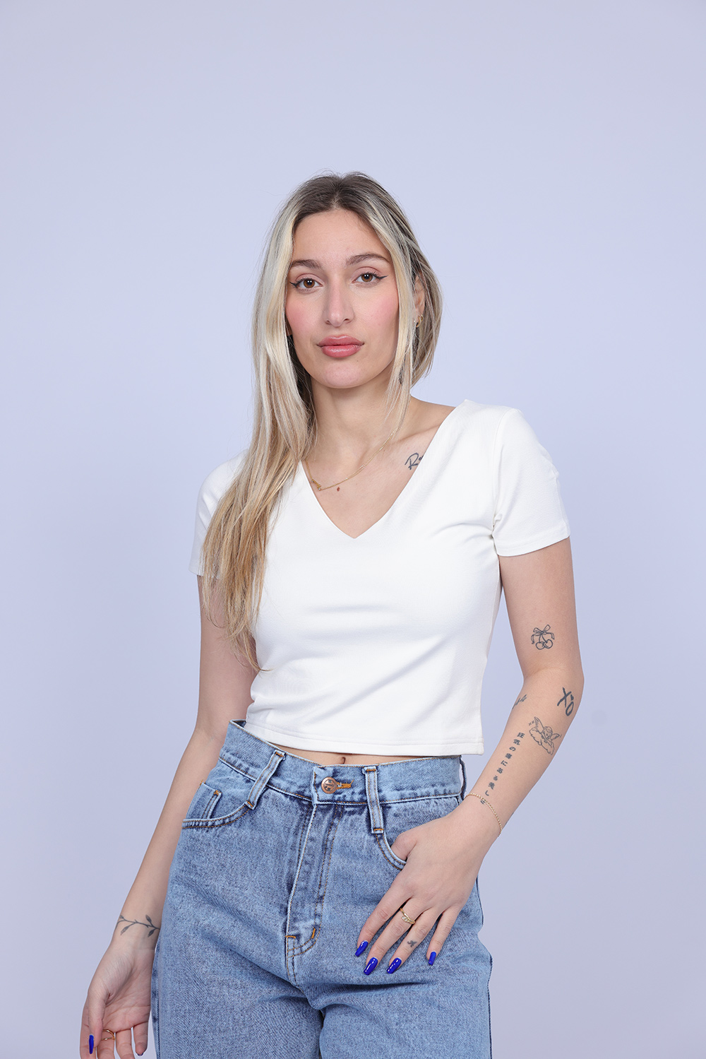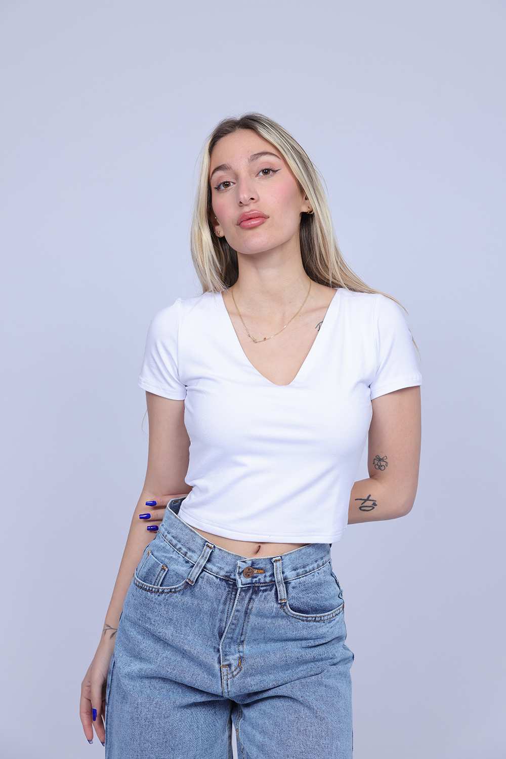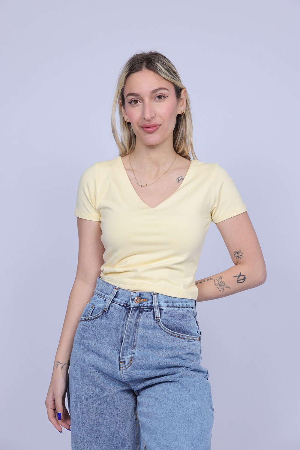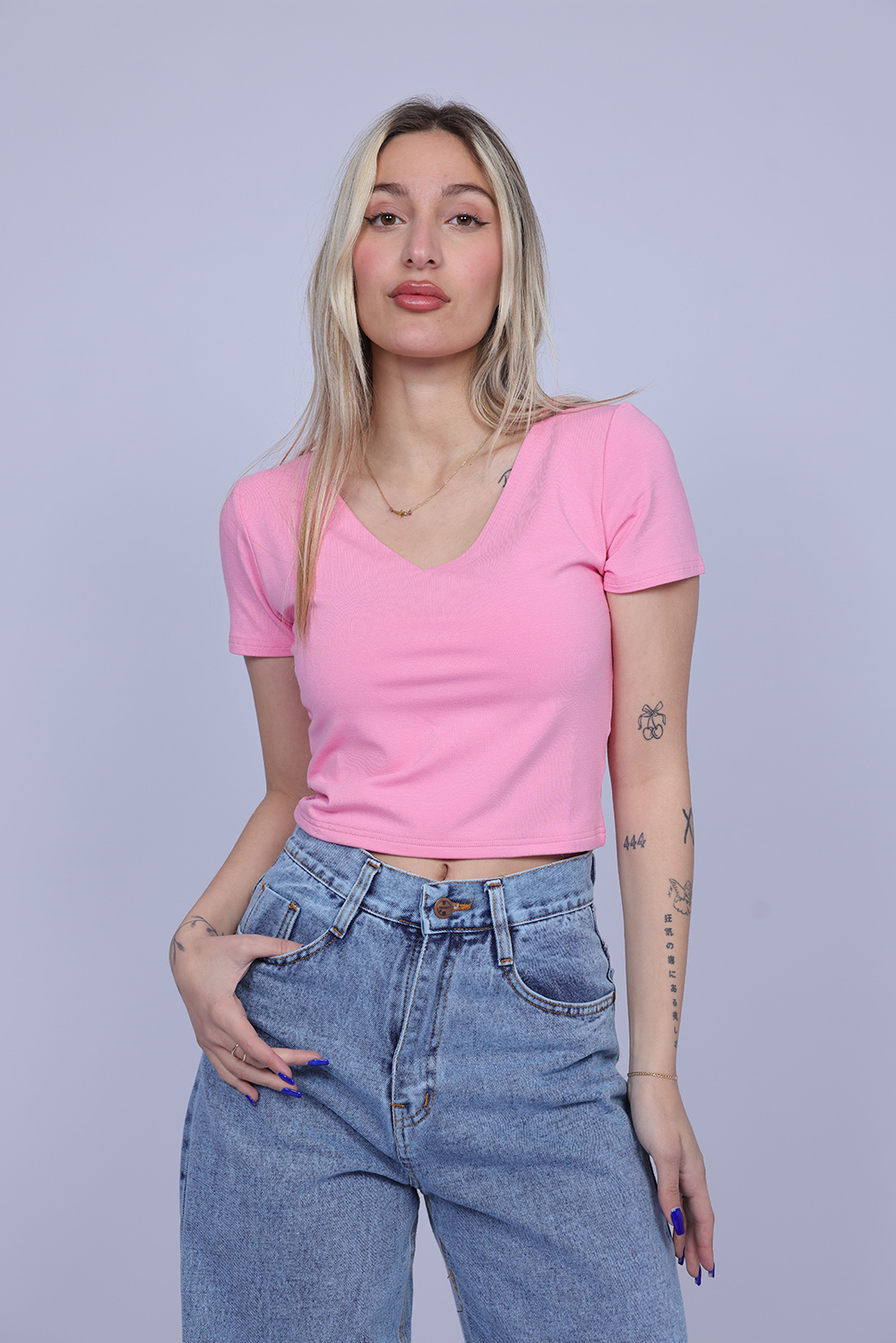 A simple and stylish cropped T-shirt designed with a flattering V-neckline that adds a feminine and modern touch. The fitted silhouette highlights the shape while keeping the look comfortable and easy to wear. Perfect for casual everyday outfits, this versatile piece pairs effortlessly with high-waisted jeans, skirts, or shorts.