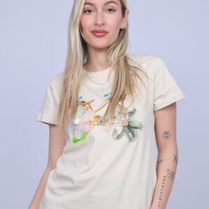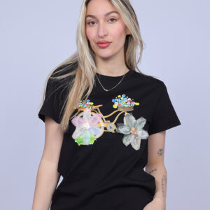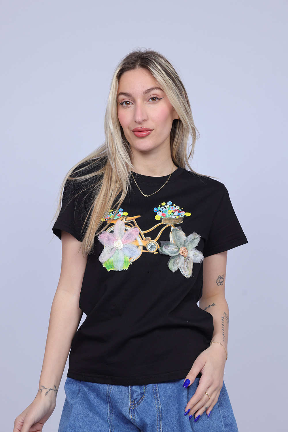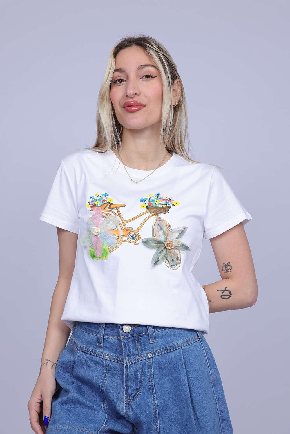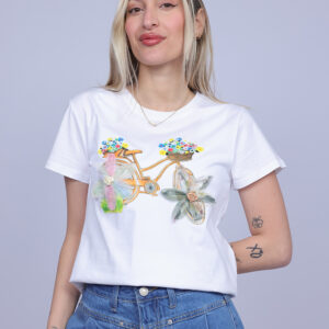 A charming T-shirt featuring a vintage bicycle graphic decorated with delicate floral accents and soft 3D flower details. The artistic design gives the piece a playful and feminine feel while adding texture and character to a casual essential. Perfect for relaxed everyday styling, this T-shirt brings a fresh and creative touch to any outfit.
