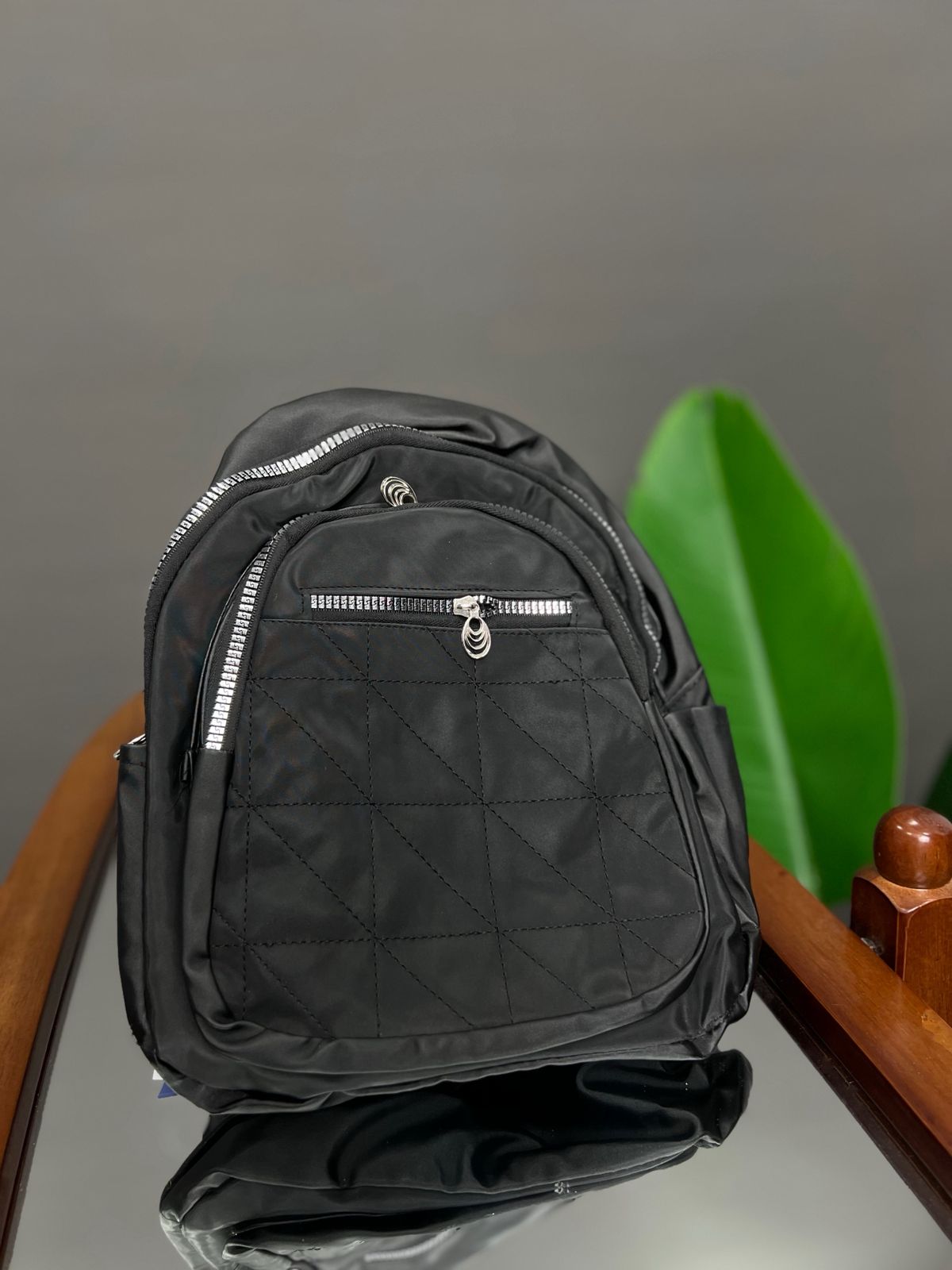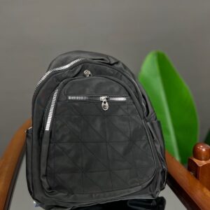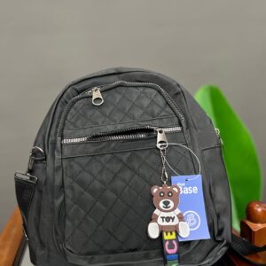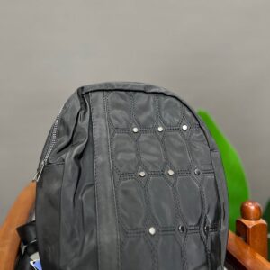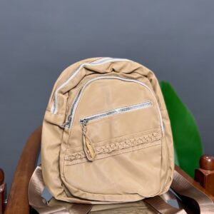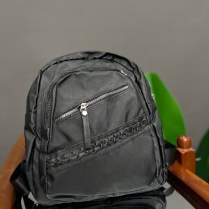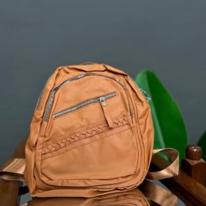 A practical and lightweight mini backpack constructed from durable nylon material. It features a rounded silhouette and ample storage with a dual-zip main compartment and two external zippered pockets. The bottom front pocket is accented with a decorative woven trim, adding a subtle textural detail to this convenient everyday bag.